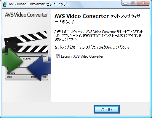 今すぐプログラムを起動する必要がなかったら、AVS Video Converter を起動しますオプションのチェックボックスをオフして、完了をクリックします。