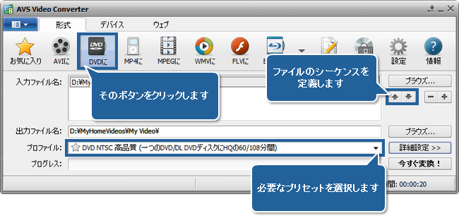 AVS Video Converter を使用したら、現行のあらゆるビデオ形式のホーム・ビデオを DVD に書き込んで、家庭用 DVD プレイヤーで再生できます。AVS Video Converter は、統合されたDVD書き込みエンジンを持っていて、広範囲なビデオ形式をサポートしているため、パーソナル DVD ビデオを作成するための完璧なツールです。ただ、以下のステップに従います。