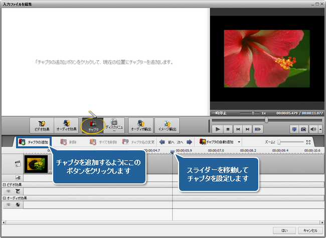 マーカーを追加するために、チャプタが始まるべきであるタイムラインの場所にマウスカーソルを置いて、マーカーパネルの追加ボタンを押します。