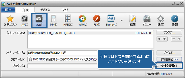 注: 入力が DVD ディスクである場合は、ソースファイルにパス (X:\Video_TS\Video_TS.IFO) を選択する必要があります。「X」は、DVD が保存されているハードディスク・ドライブ・フォルダか DVD-ROM です。他のビデオ形式にホームDVDを変換するに関して、