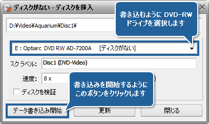 書き込みが終了した後、ディスクは自動的に取り出されます。ディスクを検証をオンにした場合は、ディスクを検証するが必要があるため、出力ファイルのサイズに応じて書き込み時間が多少長くなります。