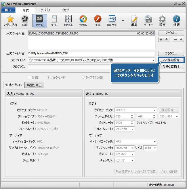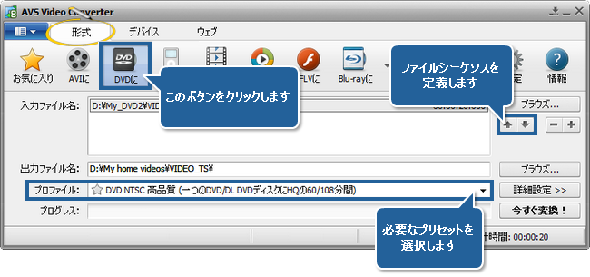 注: 入力が DVD ディスクである場合は、ソースファイルにパス (X:\Video_TS\Video_TS.IFO) を選択する必要があります。「X」は、DVD が保存されているハードディスク・ドライブ・フォルダか DVD-ROM です。他のビデオ形式にホームDVDを変換するに関して、