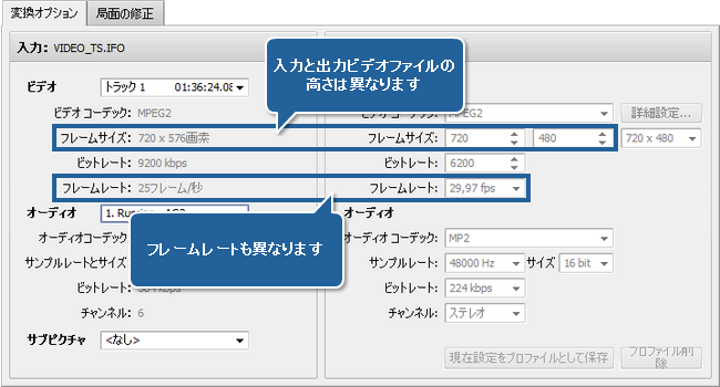 今、変換オプションタブへ戻ります。ご覧のように、入力と出力ファイルはフレームサイズ(高さ)とフレームレートで異なります: