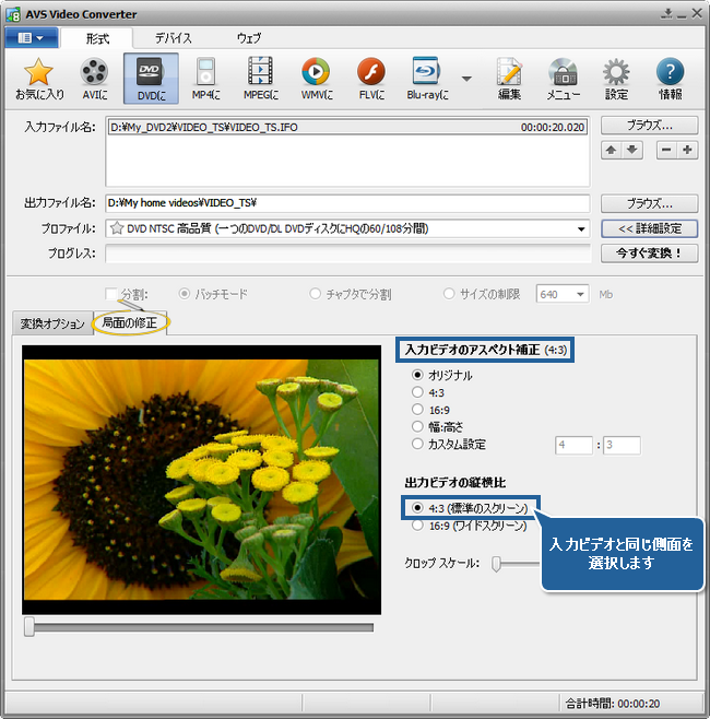 同じではなかったら、このタブの出力ビデオ局面セクションでソースビデオと同じ局面を選択します(今の場合は 4:3 です)。
