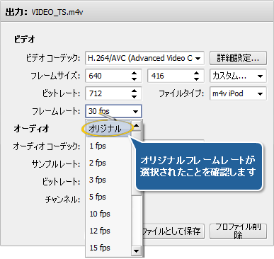 注: 携帯電話 (例えば、Apple iPhone)、もしくはその他のポータブルプレイヤーとデバイス用にビデオを変換するとき、プログラムは自動的にデバイスがサポートしている最も高いフレームレートを設定します (